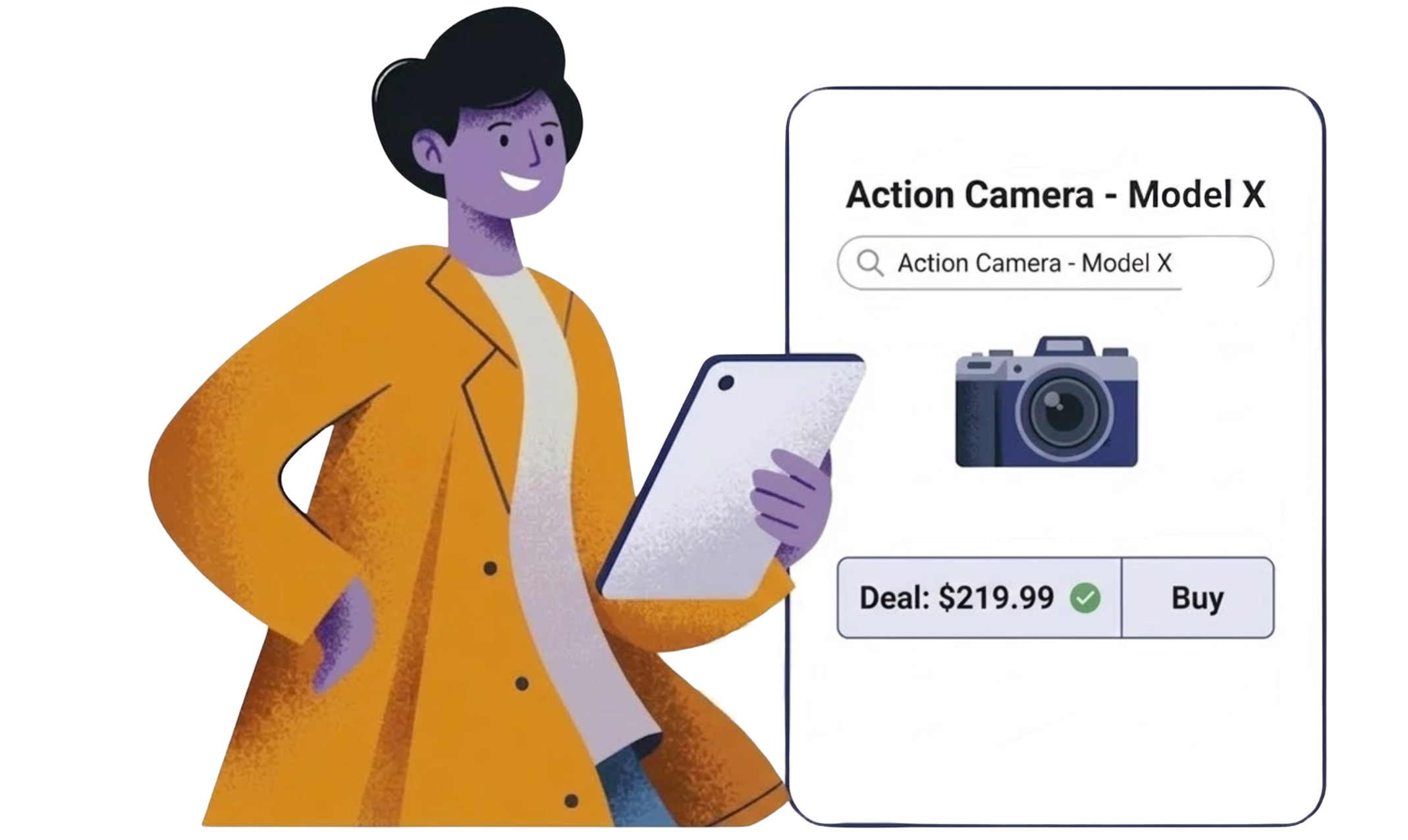 Search Amazon, Walmart, Best Buy, Target and 50+ more stores simultaneously. See the lowest price instantly.